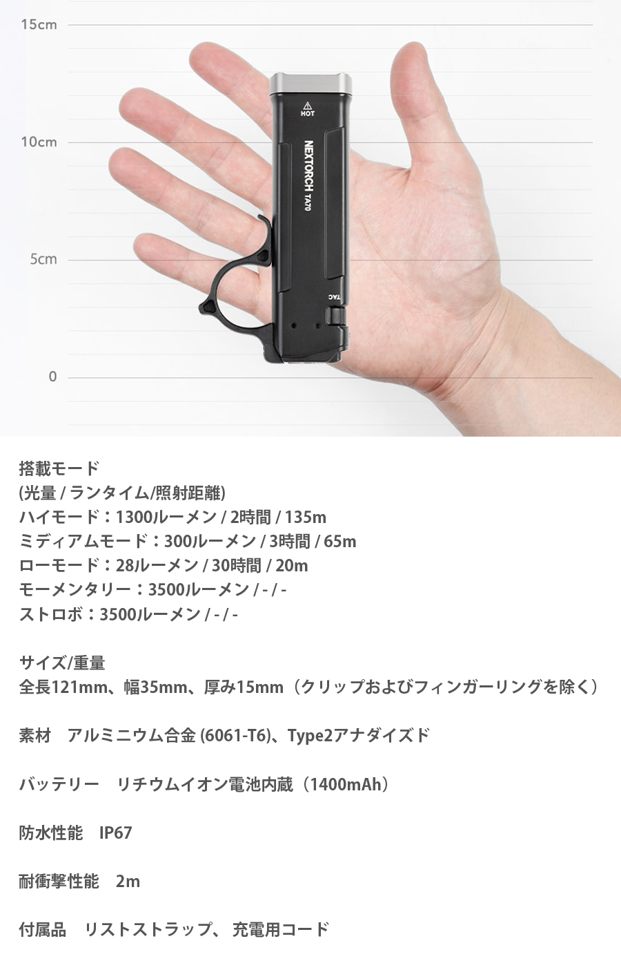 Nextorch「TA70」は、Tシリーズ(タクティカルライトライン)における超薄型モデルです。 厚さわずか約15mmというスリムなボディながら、最大3500ルーメンもの強力な光出力を実現しています。