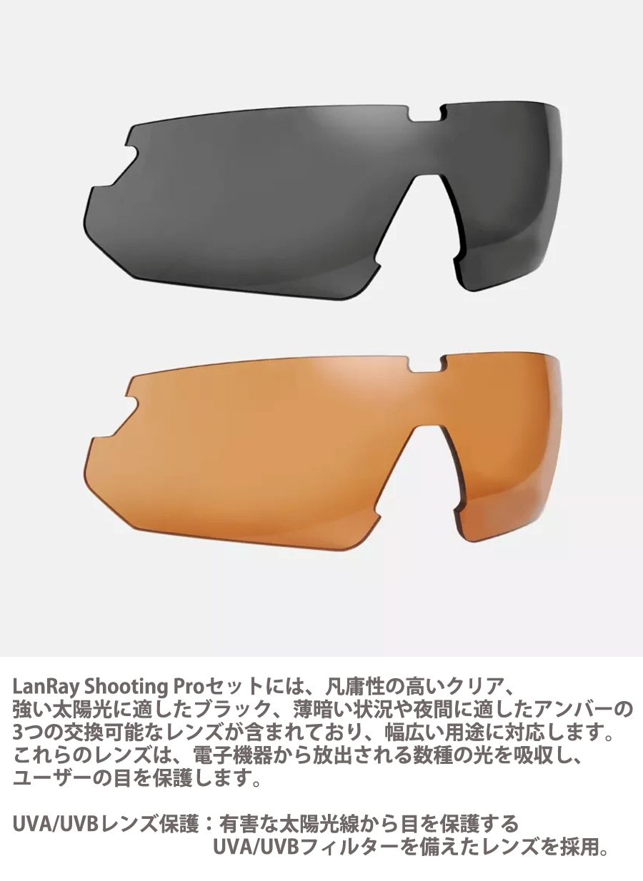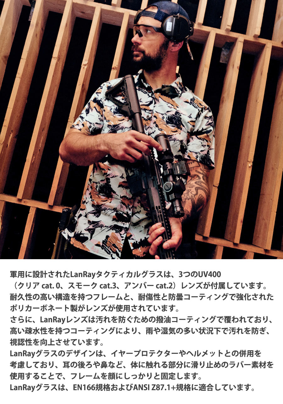 軍用に設計されたLanRayタクティカルグラスは、3つのUV400(クリア cat. 0、スモーク cat.3、アンバー cat.2)交換可能なレンズが付属しています。耐久性の高い構造を持つフレームと、耐傷性と防曇コーティングで強化されたポリカーボネート製がレンズが使用されています。さらに、LanRayレンズは汚れを防ぐための撥油コーティングで覆われており、高い疎水性を持つコーティングにより、雨や湿気の多い状況下で汚れを防ぎ、視認性を向上させています。※輸入品の為、パッケージに傷がある場合がございます。本体に影響はありませんが予めご了承ください。