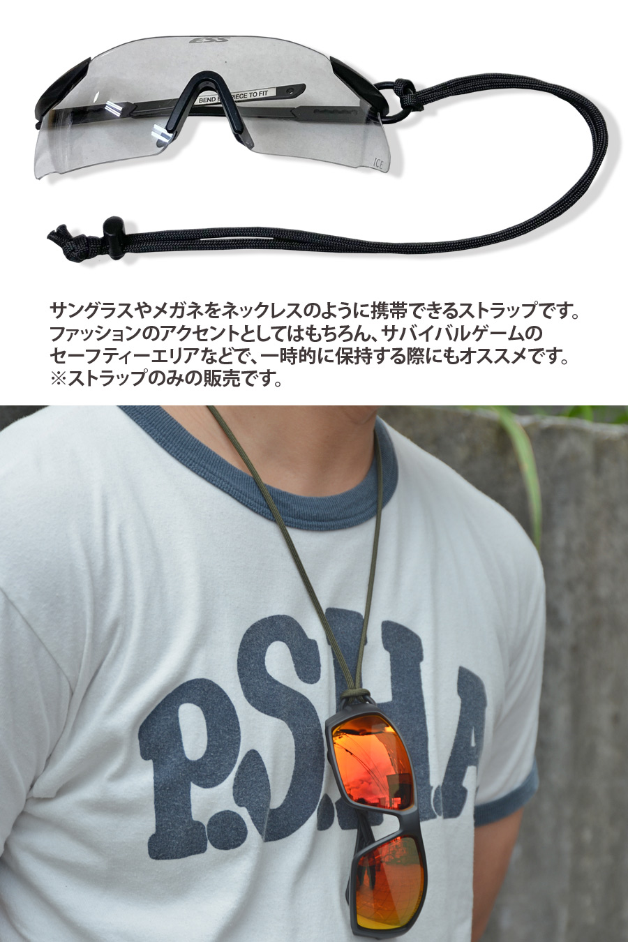 サングラスやメガネをネックレスのように携帯できるストラップです。ファッションのアクセントとしてはもちろん、サバイバルゲームのセーフティーエリアなどで、一時的に保持する際にもオススメです。※ストラップのみの販売です。