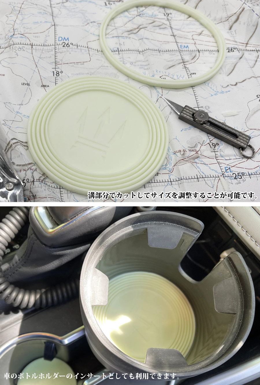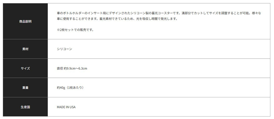 車のボトルホルダーのインサート用にデザインされたシリコーン製の蓄光コースターです。溝部分でカットしてサイズを調整することが可能。様々な車に使用することができます。蓄光素材できているため、光を吸収し暗闇で発光します。※2枚セットでの販売です。