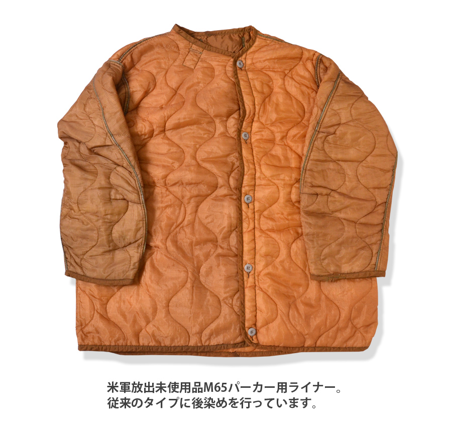 米軍放出未使用品M65パーカー用ライナー。従来のタイプに後染めを行っています。