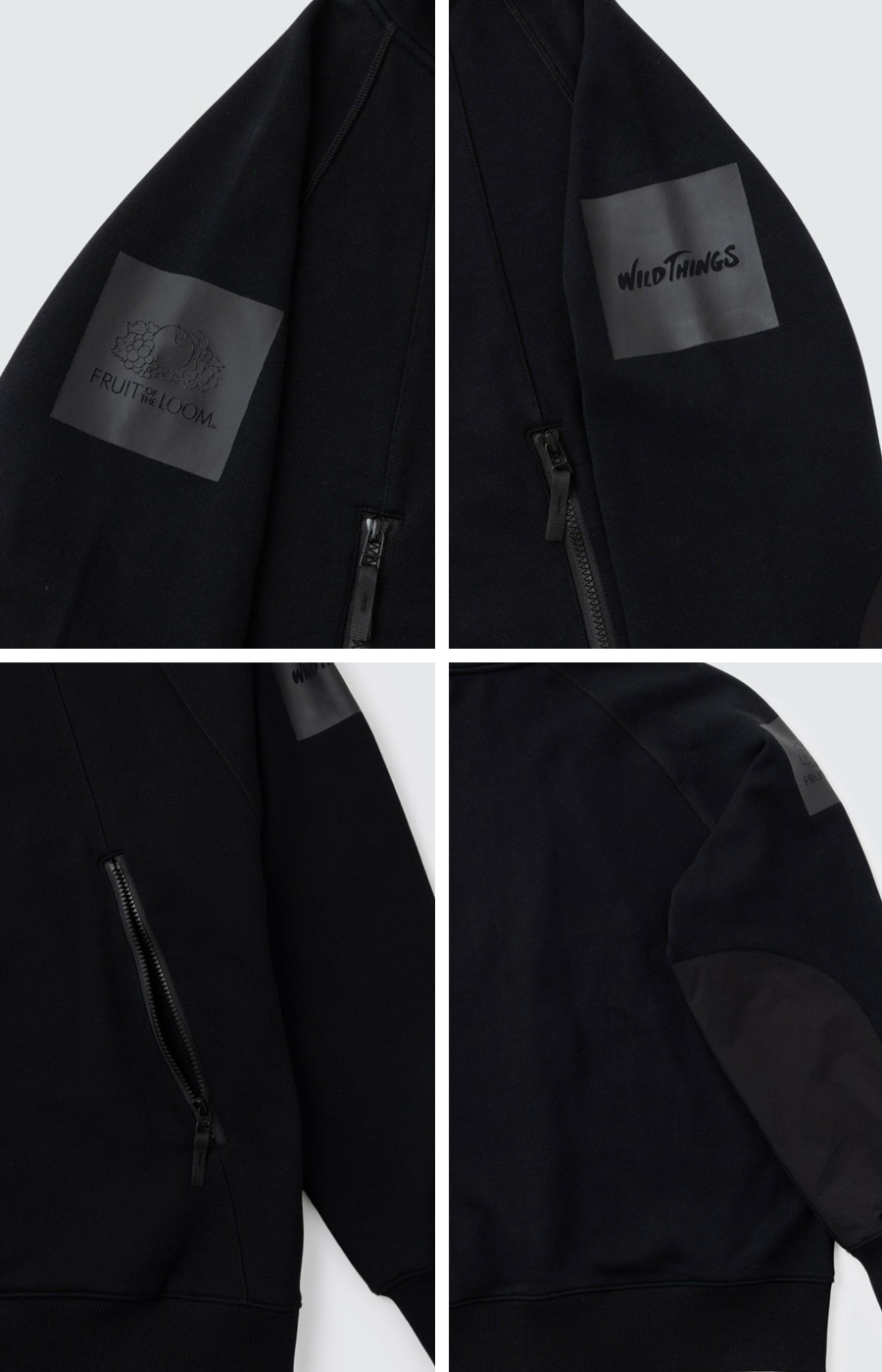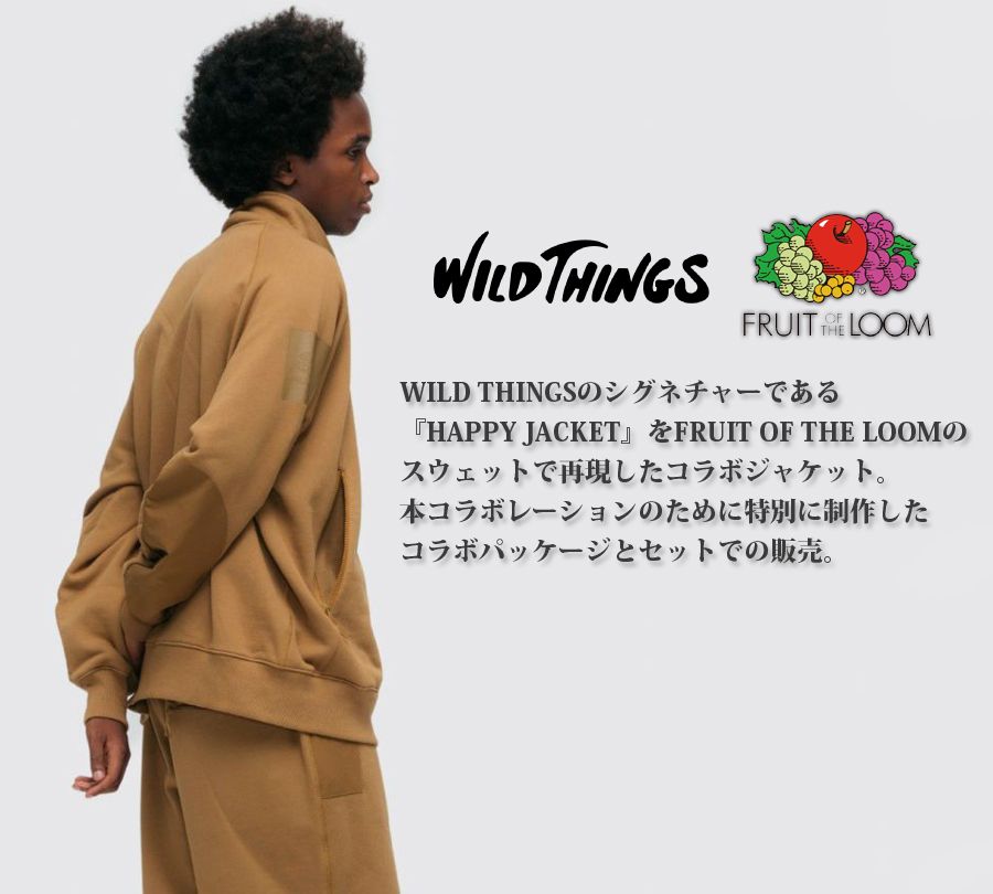WILD THINGSのシグネチャーである『HAPPY JACKET』をFRUIT OF THE LOOMのスウェットで再現したコラボジャケット。 本コラボレーションのために特別に制作したコラボパッケージとセットでの販売。